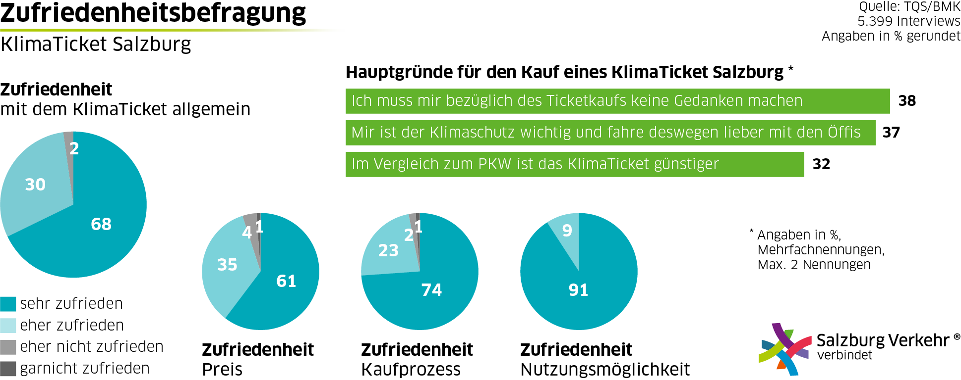 Bei der allgemeinen Zufriedenheit gibt es für das KlimaTicket Salzburg Bestnoten: 68 % der Kund:innen sind sehr zufrieden, 30 % eher zufrieden – das ergibt 98 % zufriedene Kund:innen. Die wichtigsten Gründe für den Kauf eines KlimaTickets Salzburg sind die Flexibilität (kein einzelner Ticketkauf mehr nötig), der Klimaschutz und die Ersparnis im Vergleich zum PKW. Besonders zufrieden sind die KlimaTicket Salzburg-Nutzer:innen mit dem Preis vom 365 € bzw. 274 € für ein Jahr klimaschonende Mobilität – 61 % sind mit der Preisgestaltung sehr zufrieden, 35 % eher. Ebenfalls sehr gut bewertet wird der Kaufprozess (74 % sehr, 23 % eher zufrieden) und die Nutzungsmöglichkeiten des Tickets (91 % sehr, 9 % eher zufrieden).