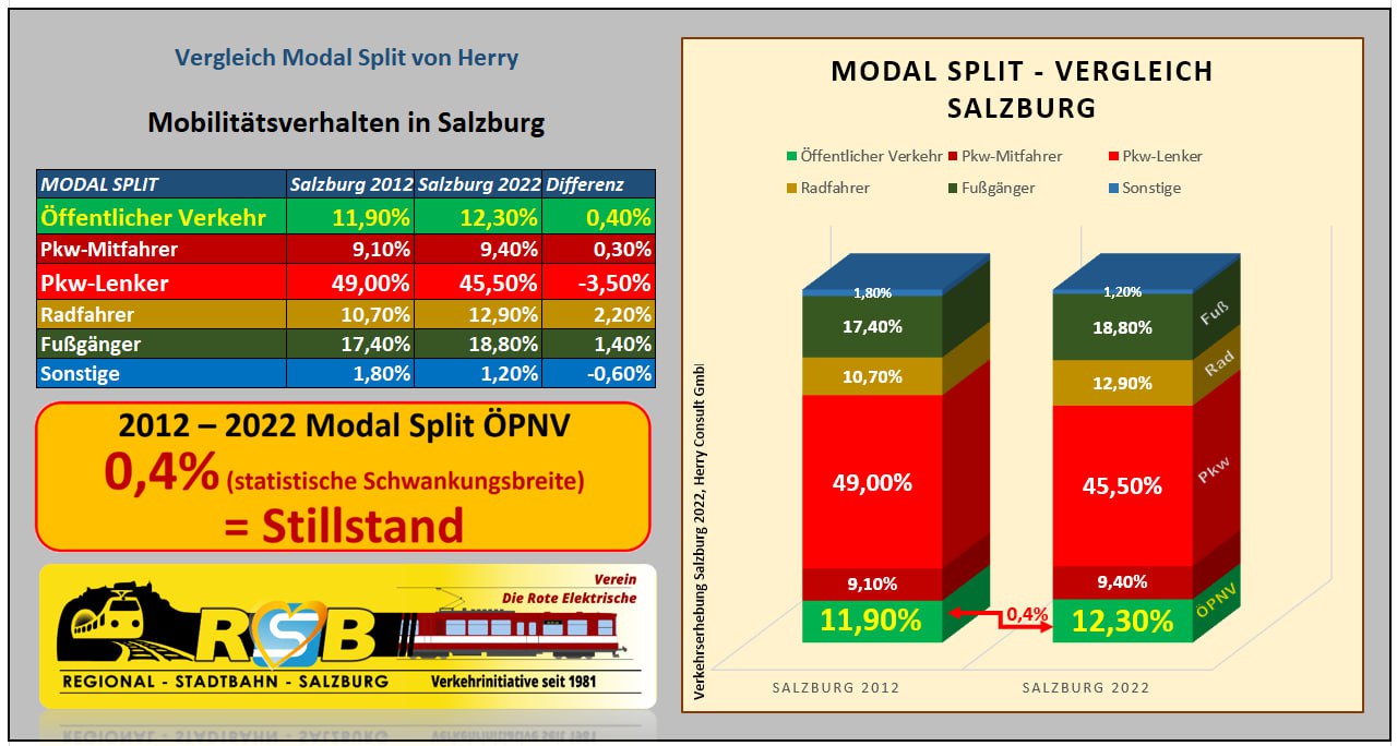Obwohl die Landes-Planungsbeamten versuchen, diesen Stillstand (Schwankungsbreite 0,4%) als Erfolg zu verkaufen (ORF-Salzburg Heute 5.10.2023) ist die Entwicklung ein bedauernswertes Trauerspiel. In Linz hat der ÖPNV einen Modal Split 21%, Nürnberg 22% und Wien 29%! In Wien haben übrigens über 50% der Haushalte kein eigenes Auto mehr. Da sind wir in Salzburg Lichtjahre davon entfernt.