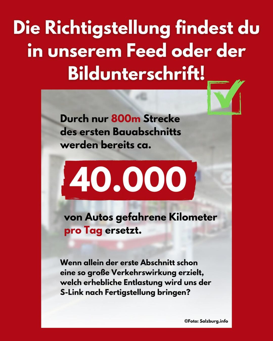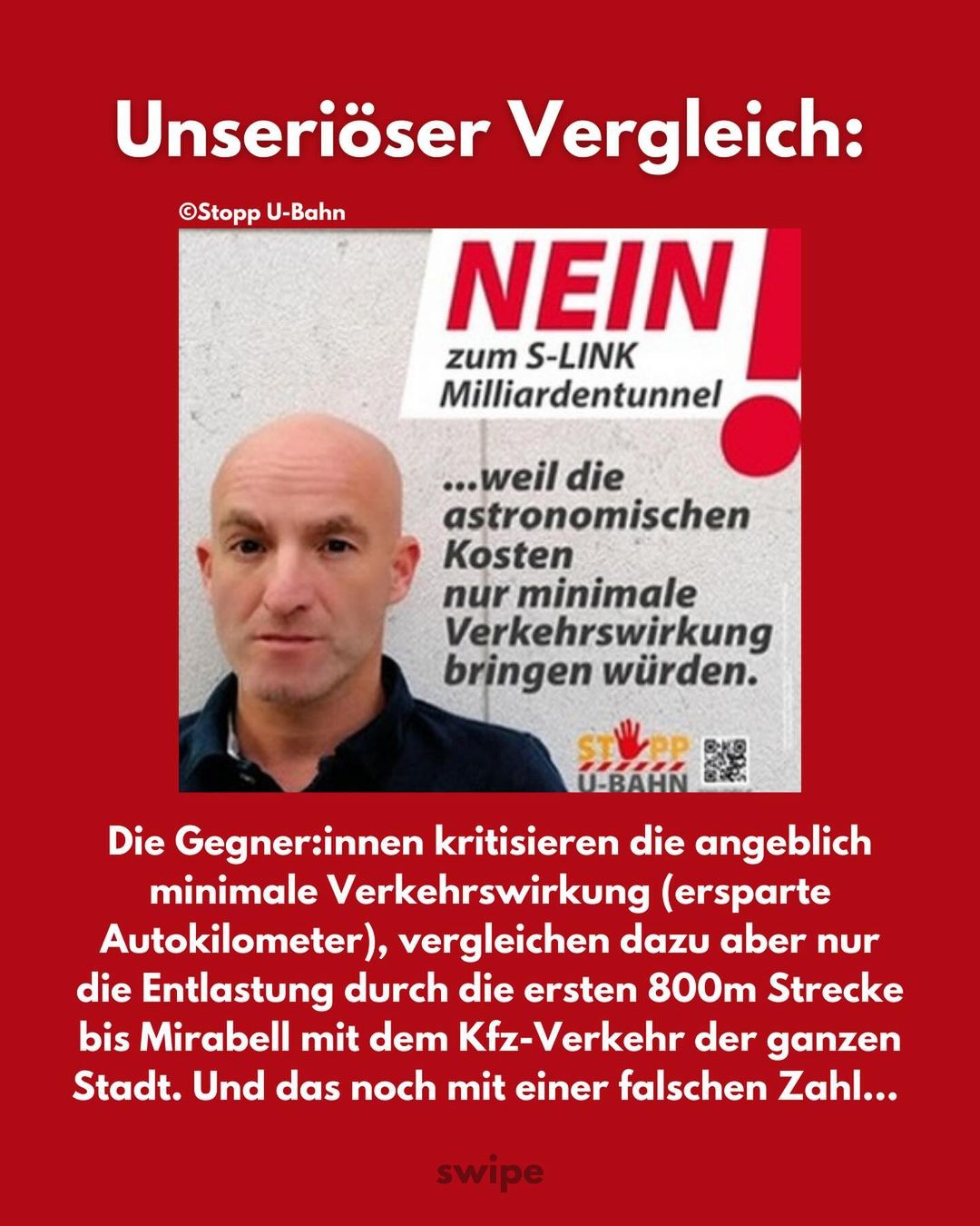 Die von der Gegner:innen-Initiative propagierte „minimale“ Verkehrswirkung des S-Link von „1%“ bezieht sich einerseits nur auf den ersten Bauabschnitt des großen Projekts, andererseits aber auf die Verkehrsleistung der gesamten Stadt+Flachgau, was sie wiederum falsch (nur „Stadt“) angeben. — ein sehr fehlerhafter methodisch unseriöser Vergleich.