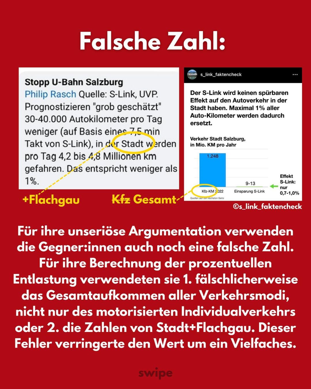 Falsche Zahl: Die Gegner:innen beziehen sich zwar ebenfalls die UVP-Unterlagen, für ihre unseriöse Argumentation verwenden sie allerdings auch noch eine falsche Zahl. Für ihre Berechnung der prozentuellen Entlastung verwendeten sie 1. fälschlicherweise das Gesamtaufkommen aller Verkehrsmodi, nicht nur des motorisierten Individualverkehrs oder 2. die Zahlen von Stadt+Flachgau. Dieser Fehler verringerte den Wert um ein Vielfaches.