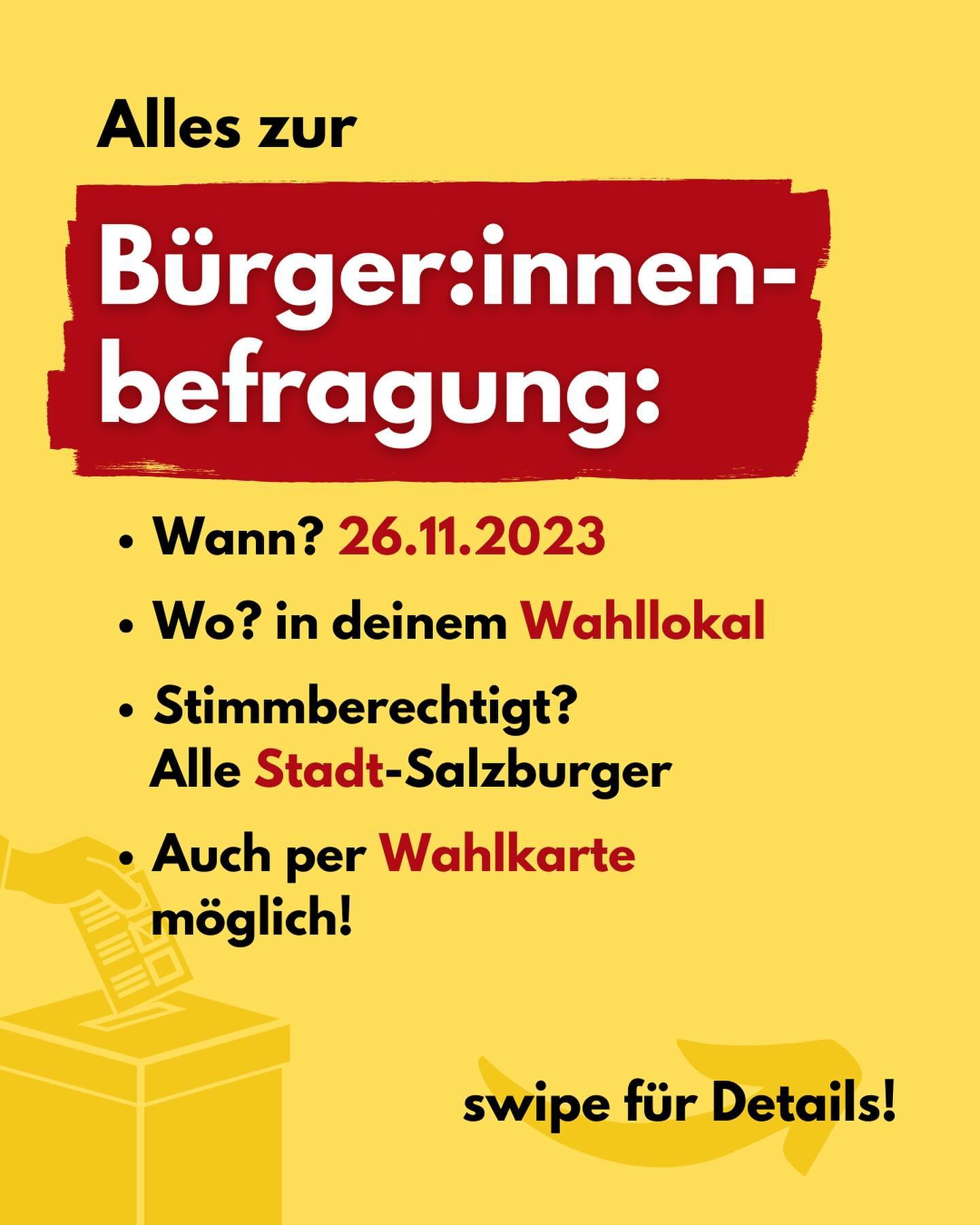 Stimmberechtigt sind alle österreichischen und EU-Bürger:innen, die vom Wahlrecht nicht ausgeschlossen sind, bis zum Ende des Tages der Abstimmung das 16. Lebensjahr vollendet und am Stichtag (25. September 2023) ihren Hauptwohnsitz in der Stadt Salzburg haben.