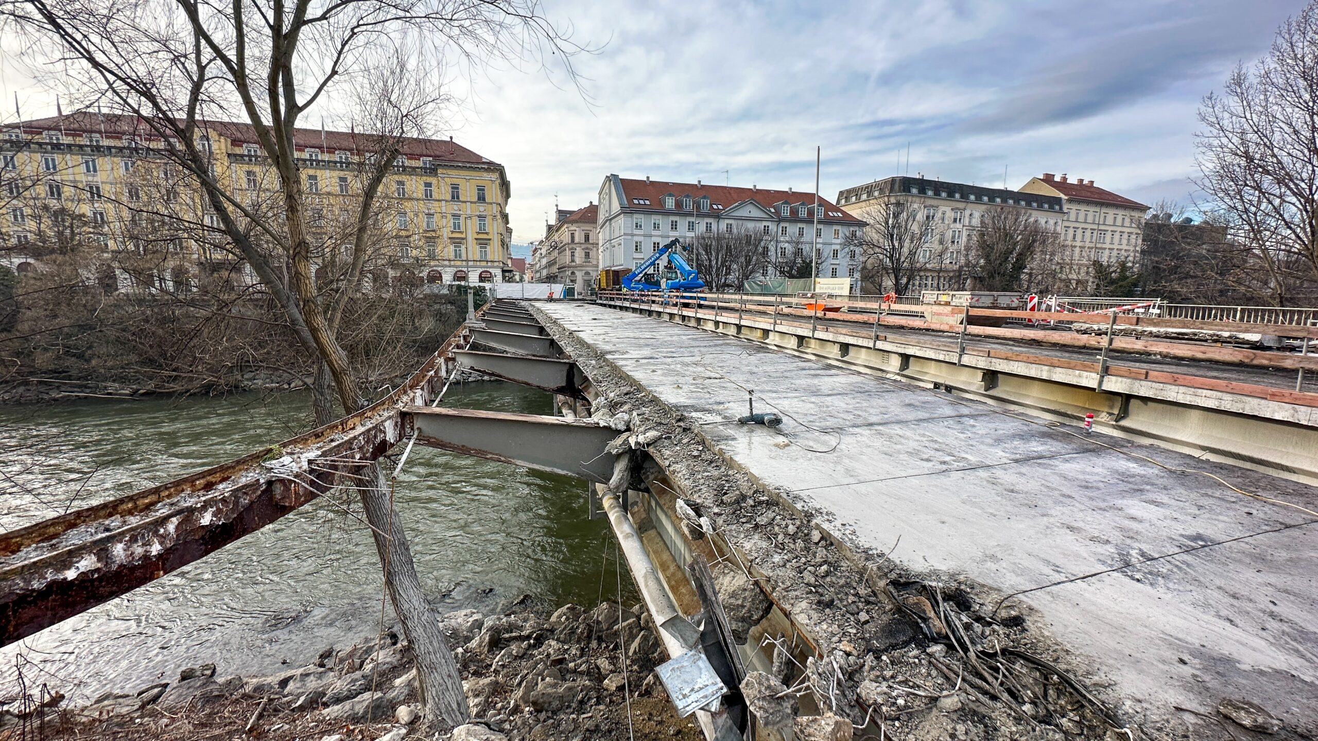 Für die sogenannte „statische Ertüchtigung“ der Brücke werken die Bauarbeiter:innen deshalb seit 8. Jänner auf Hochtouren: Der Asphalt wurde bereits abgefräst, Fahrbahnplatte und Kragarme werden in Teile geschnitten und abtransportiert.