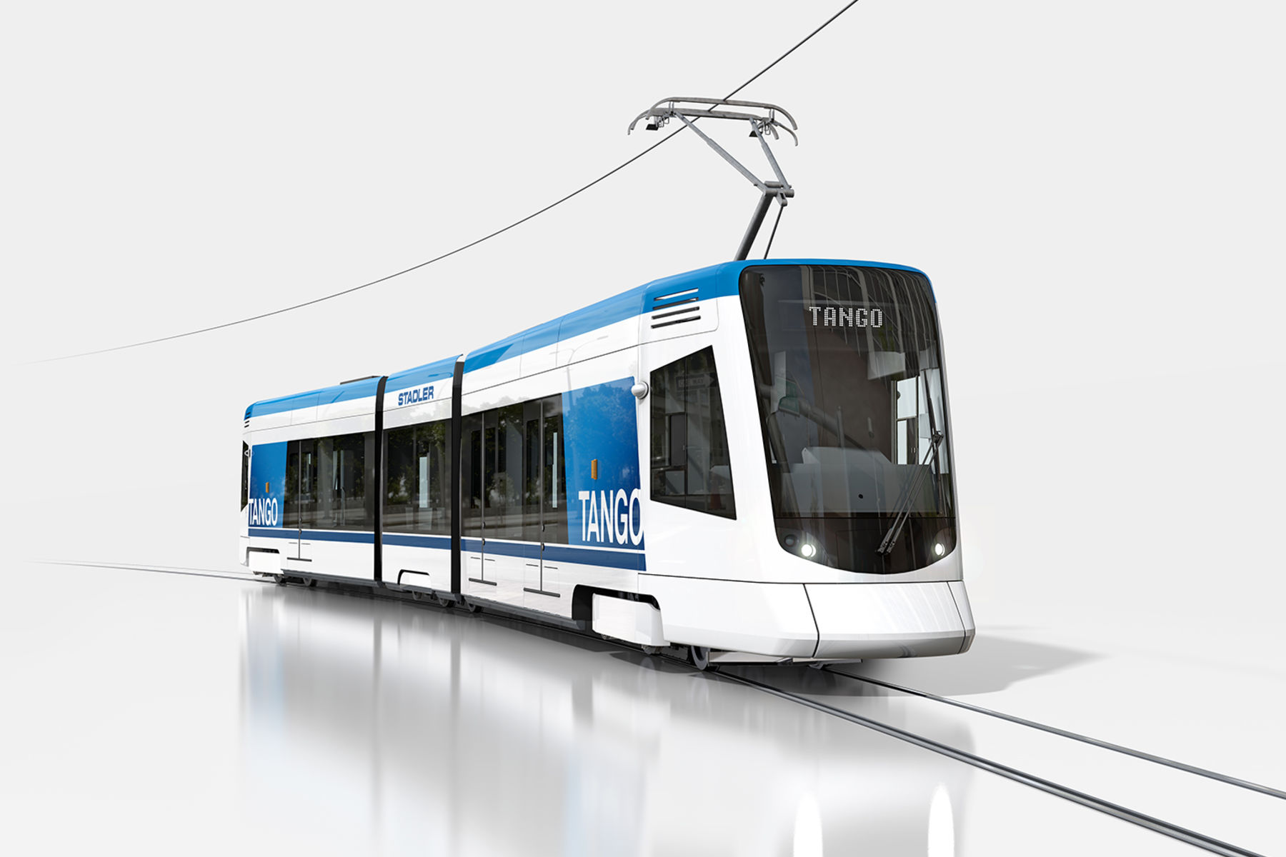 TANGO ist eine Stadtbahn mit hohen Individualisierungsmöglichkeiten. TANGO kann als klassische Strassenbahn, aber auch als Überlandbahn mit einer maximalen Geschwindigkeit von 100 km/h konfiguriert werden. © Stadler Rail AG
