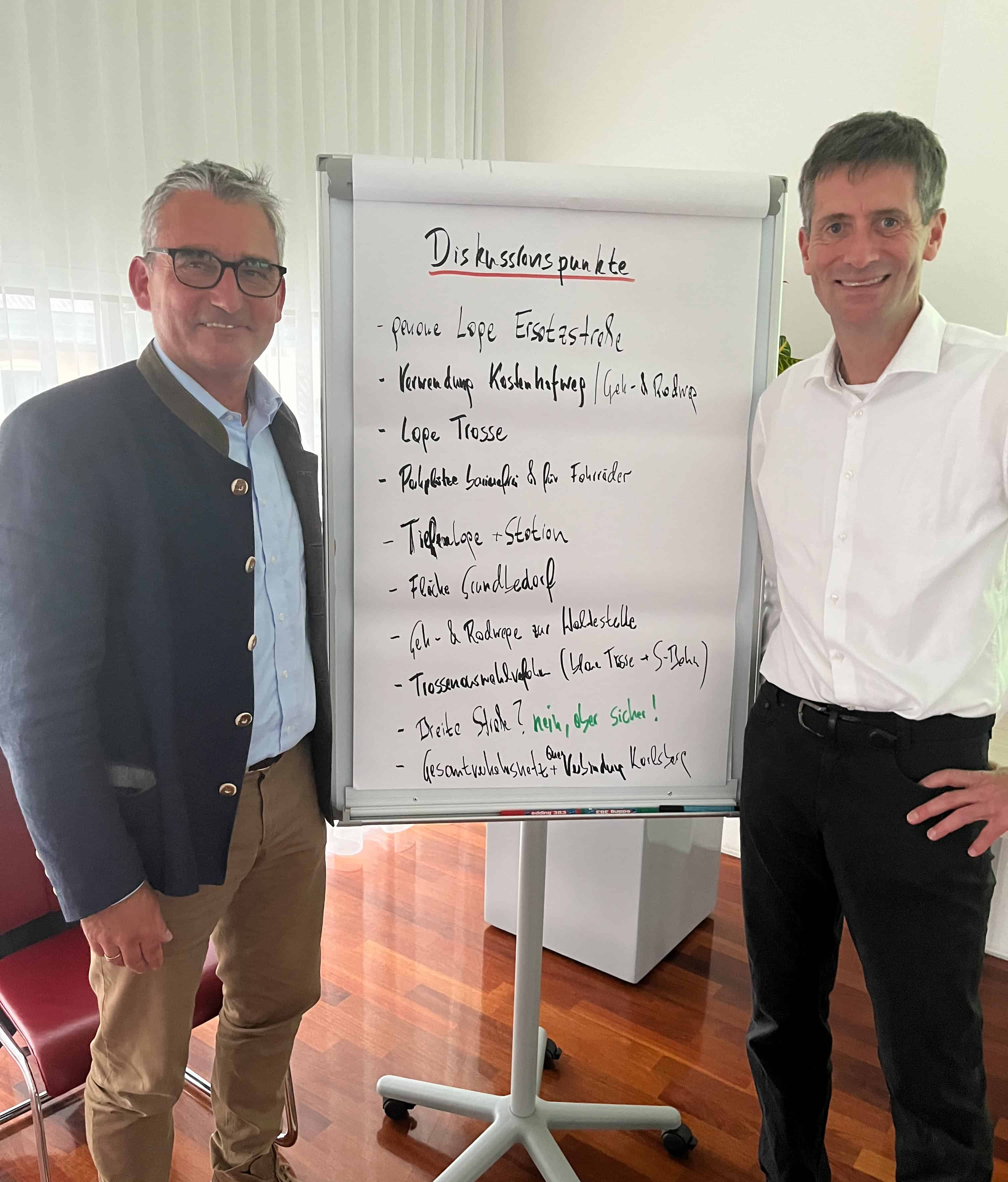 Anifs Bürgermeisterin Gabriella Gehmacher-Leitner und S-LINK-Geschäftsführer Stefan Knittel (v.l.) diskutieren mit Bürgerinnen und Bürgern über die Zukunft der Gemeinde. © S-LINK