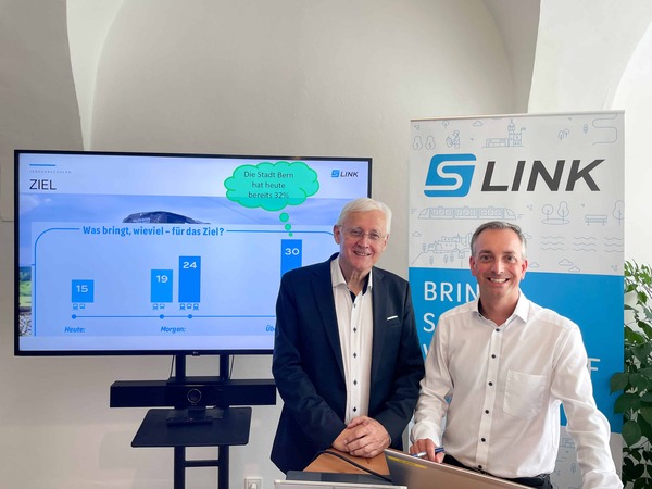 Günther Penetzdorfer (Geschäftsführer Metapublic-Relations) und Albert Greinmeister (Projektleiter S-LINK) zeigen, wie mit einem attraktiven Gesamtangebot der Anteil des öffentlichen Verkehrs deutlich erhöht werden kann. © S-LINK