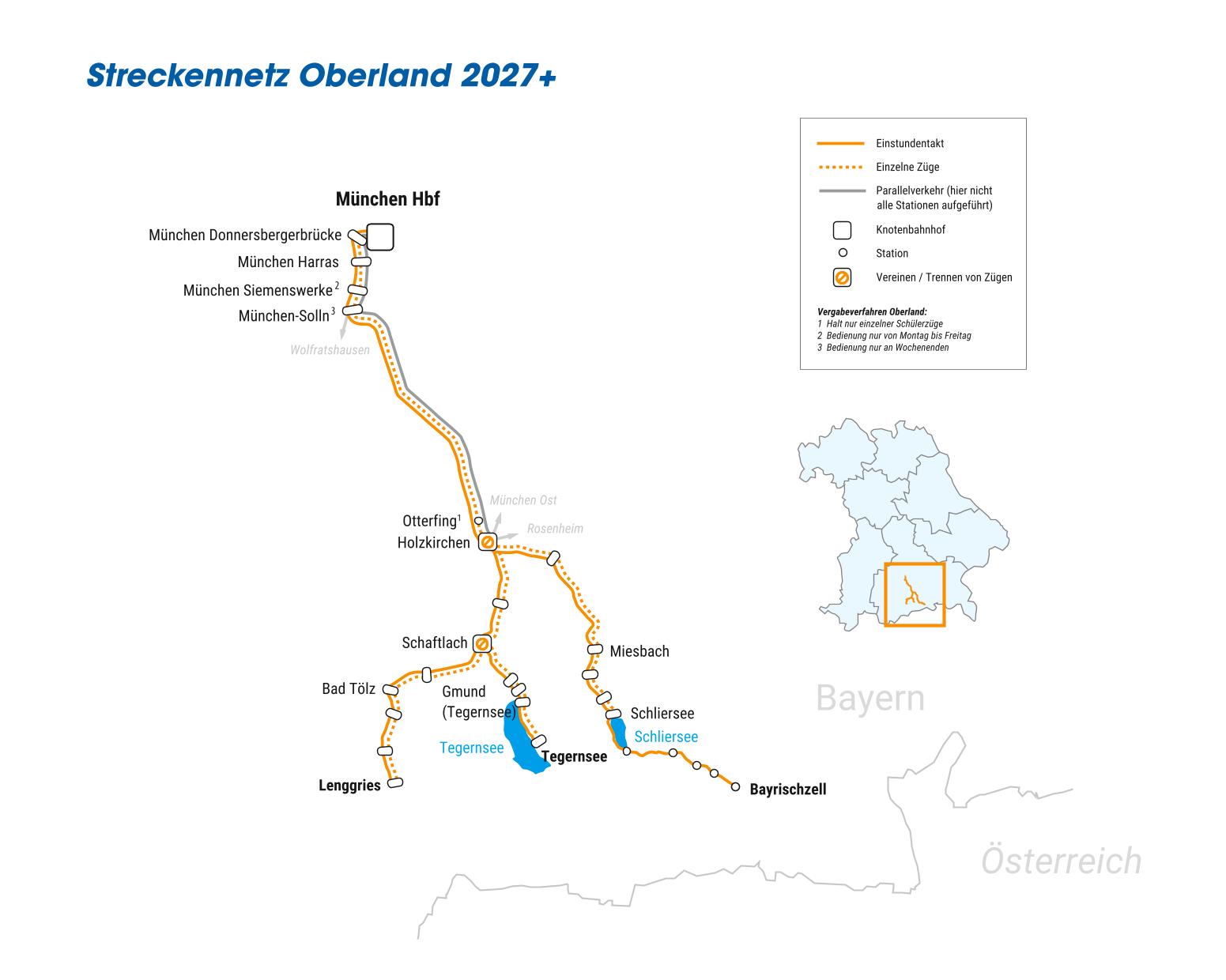 Die Bayerische Eisenbahngesellschaft (BEG) hat im Juli 2024 den Zuschlag im Vergabeverfahren Oberland 2027+ erteilt: Die Bayerische Oberlandbahn wird auch weiterhin den dieselbetriebenen Regionalzugverkehr auf den Strecken zwischen München und Lenggries, Tegernsee sowie Bayrischzell betreiben. Der neue Verkehrsvertrag läuft von Dezember 2026 bis Dezember 2034. Vor dem Hintergrund der ausgereizten Infrastruktur wird das aktuelle Verkehrsangebot unverändert fortgeschrieben.
