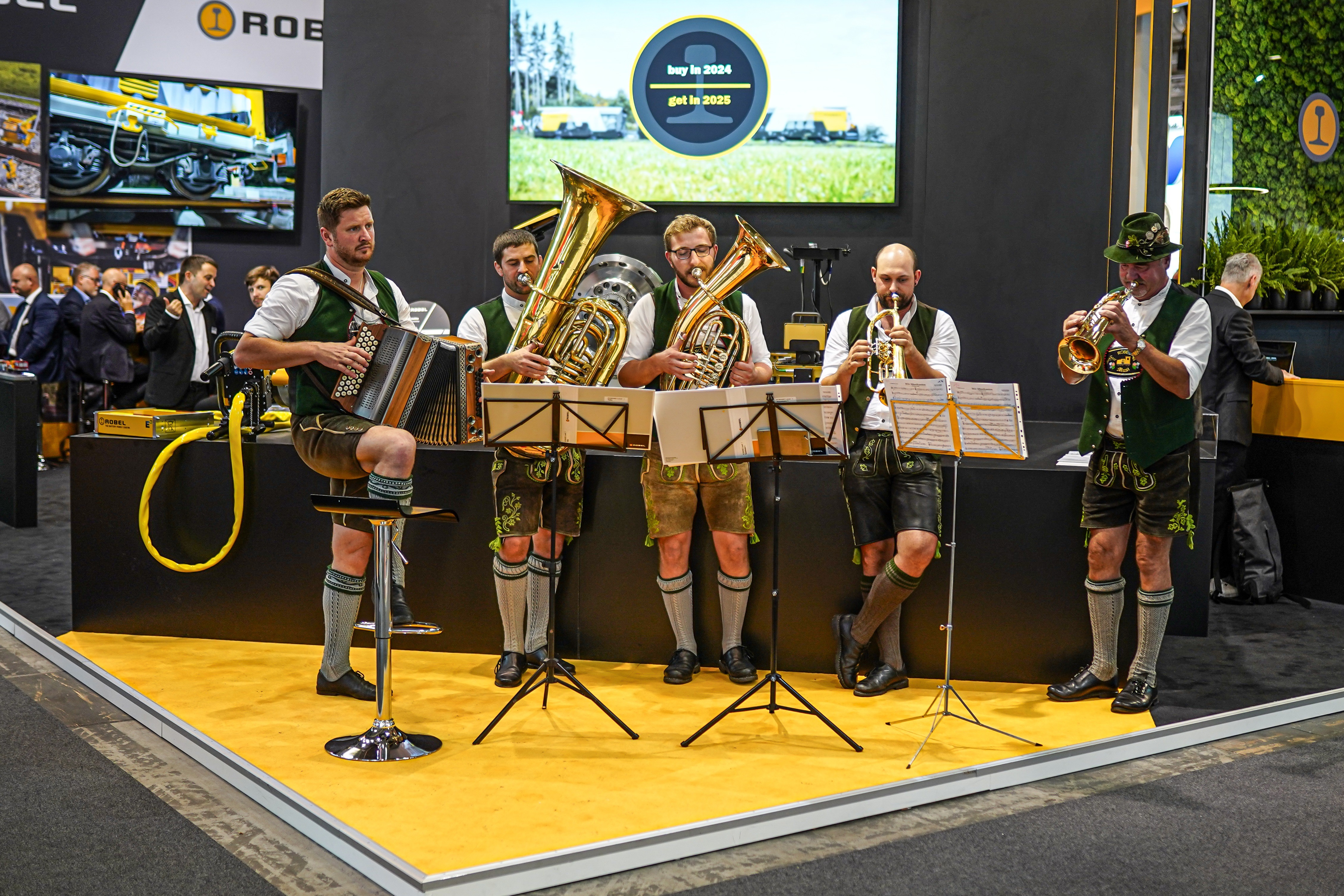 ... Robel Hybrid-Gleiskraftwagen an Oliver Glaser, Leiter Geschäftsbereich Schiene der Stadtwerke München (SWM) und Mitglied der Geschäftsführung der Münchner Verkehrsgesellschaft (MVG) sowie Christian Schallenkammer, Projektleiter Schienenfahrzeugbeschaffung bei den SWM. Eine Messeneuheit aus Freilassing für die bayrische Landeshauptstadt, eine Abordnung der Robel Werkskapelle und großes Publikumsinteresse sorgten kurzfristig für Oktoberfeststimmung am InnoTrans Außengelände.