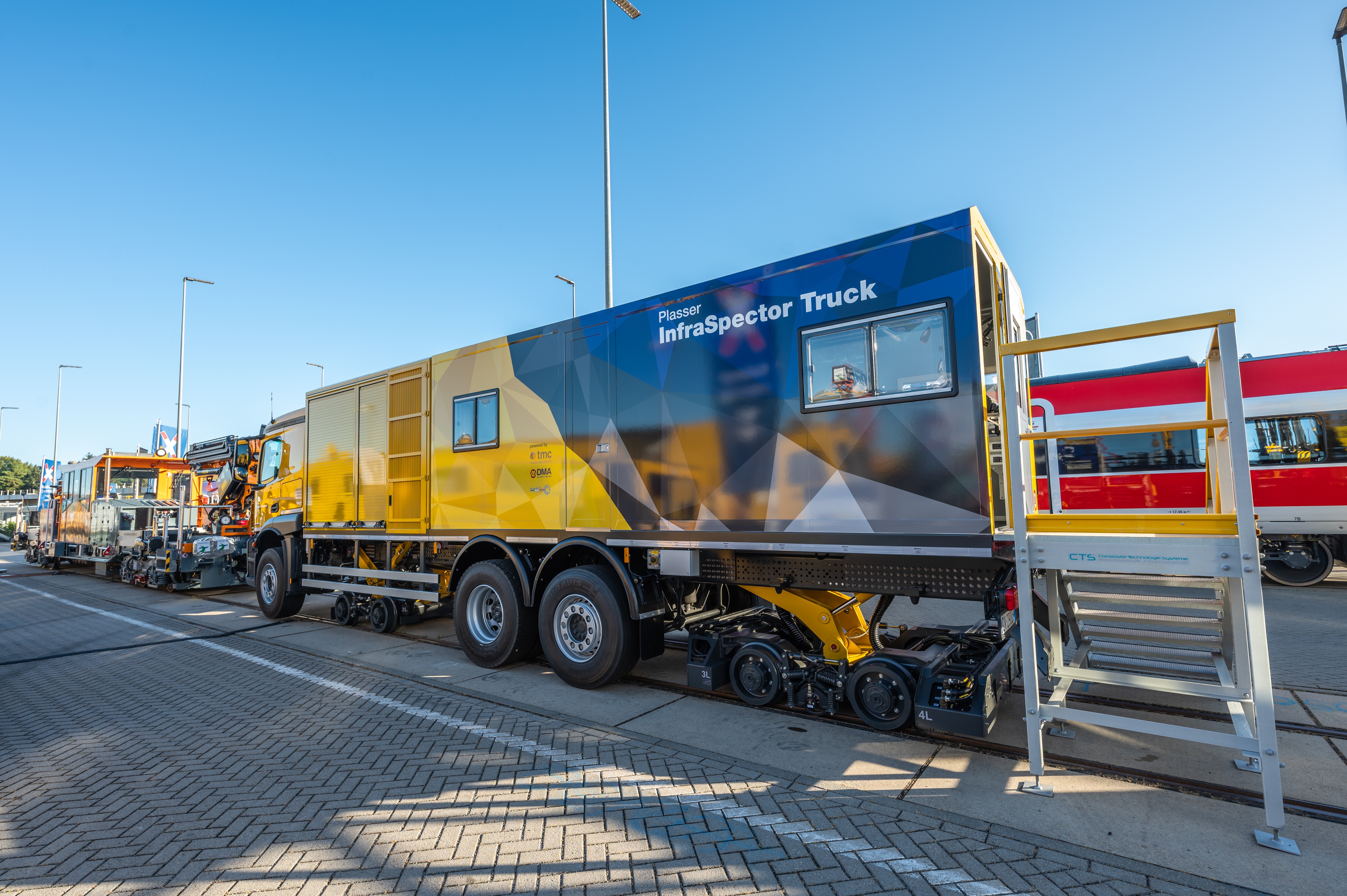 Eine neue Lösung für die Inspektion und Vermessung der Infrastruktur insbesondere regionaler und urbaner Netze ist der Plasser InfraSpector. Er bietet hohe Flexibilität, in der gezeigten Dienstleistungs-Version von Plasser Italiana als Aufbau auf einem Zweiwege-LKW. Alternativ sind Versionen des Prüfmittels im Container oder auf Basis des MultiCrafters möglich. Plasser InfraSpector folgt der Norm ISO IEC 17025 für Qualität und Zuverlässigkeit. Die Diagnose untersucht den Fahrweg mit Gleisgeometrie, Schienen- und Lichtraumprofil, Untergrund, Weiche und Oberleitung.