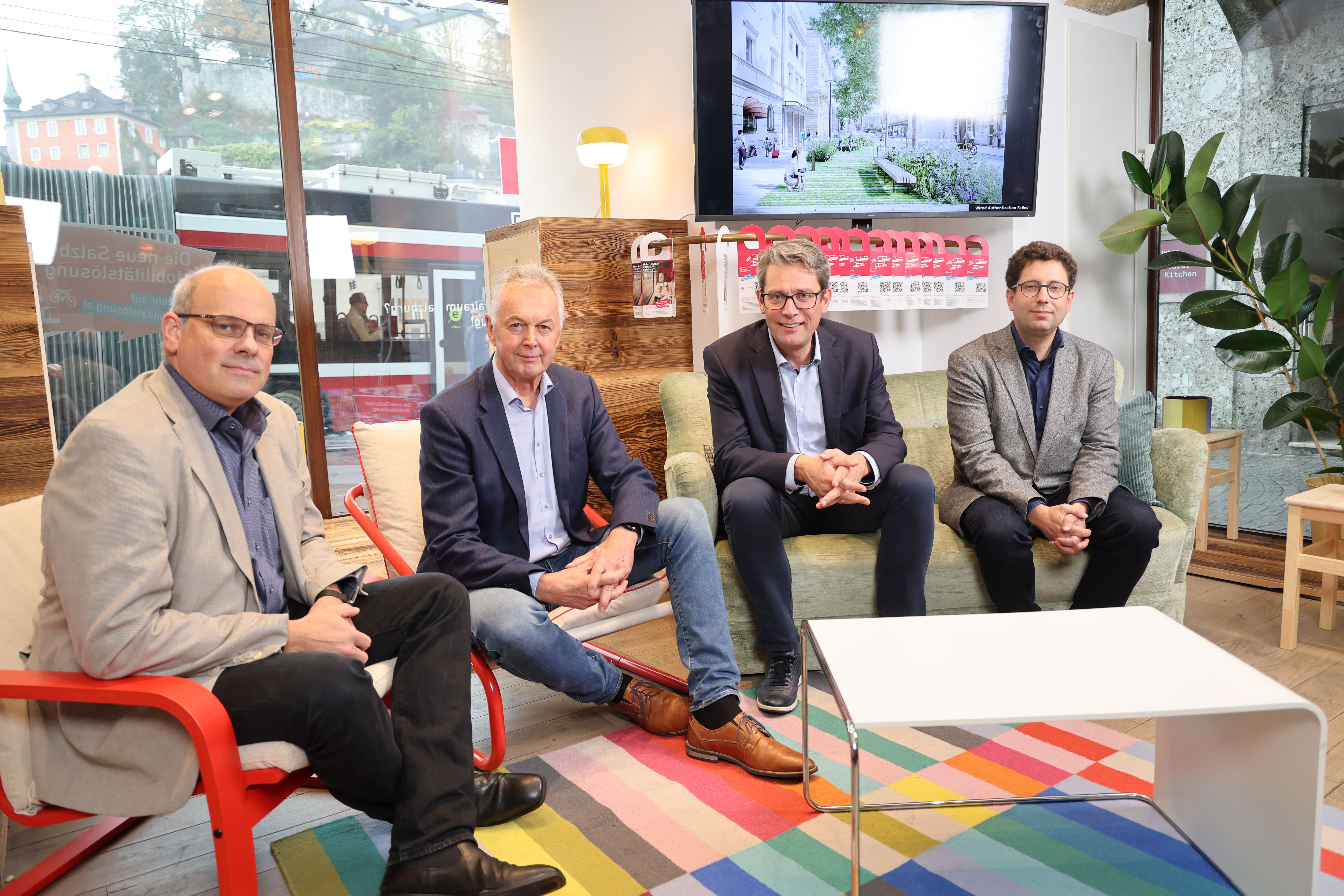 Dipl.-Ing. Gernot Jedlitschka (Geschäftsführer Geoconsult ZT GmbH), Dipl.-Ing. Manfred Eder (Geschäftsführer Laabmayr & Partner ZT GmbH), Mag. Johannes Gfrerer (Geschäftsführer Salzburger Verkehrsverbund) und Dipl. Bau-Ing. Dr. Erich Saurer © Salzburger Verkehrsverbund/ Leo Neumayr