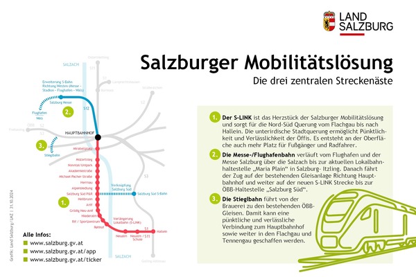 Der S-Link, also die unterirdische Verlängerung der S-Bahn bis Salzburg Süd und oberirdisch weiter bis nach Hallein bleibt bei der Salzburger Mobilitätslösung das Herzstück. Ohne ihn wären alle weiteren Streckenäste im Sinne der angestrebten Verkehrsentlastung nicht möglich. Er sorgt für die Nord-Süd Querung und ermöglicht durch seine Unabhängigkeit vom Verkehr in der Stadt über ihm die Pünktlichkeit und Verlässlichkeit der Öffis. Zudem entsteht an der Oberfläche auch mehr Platz für Fußgänger und Radfahrer.
