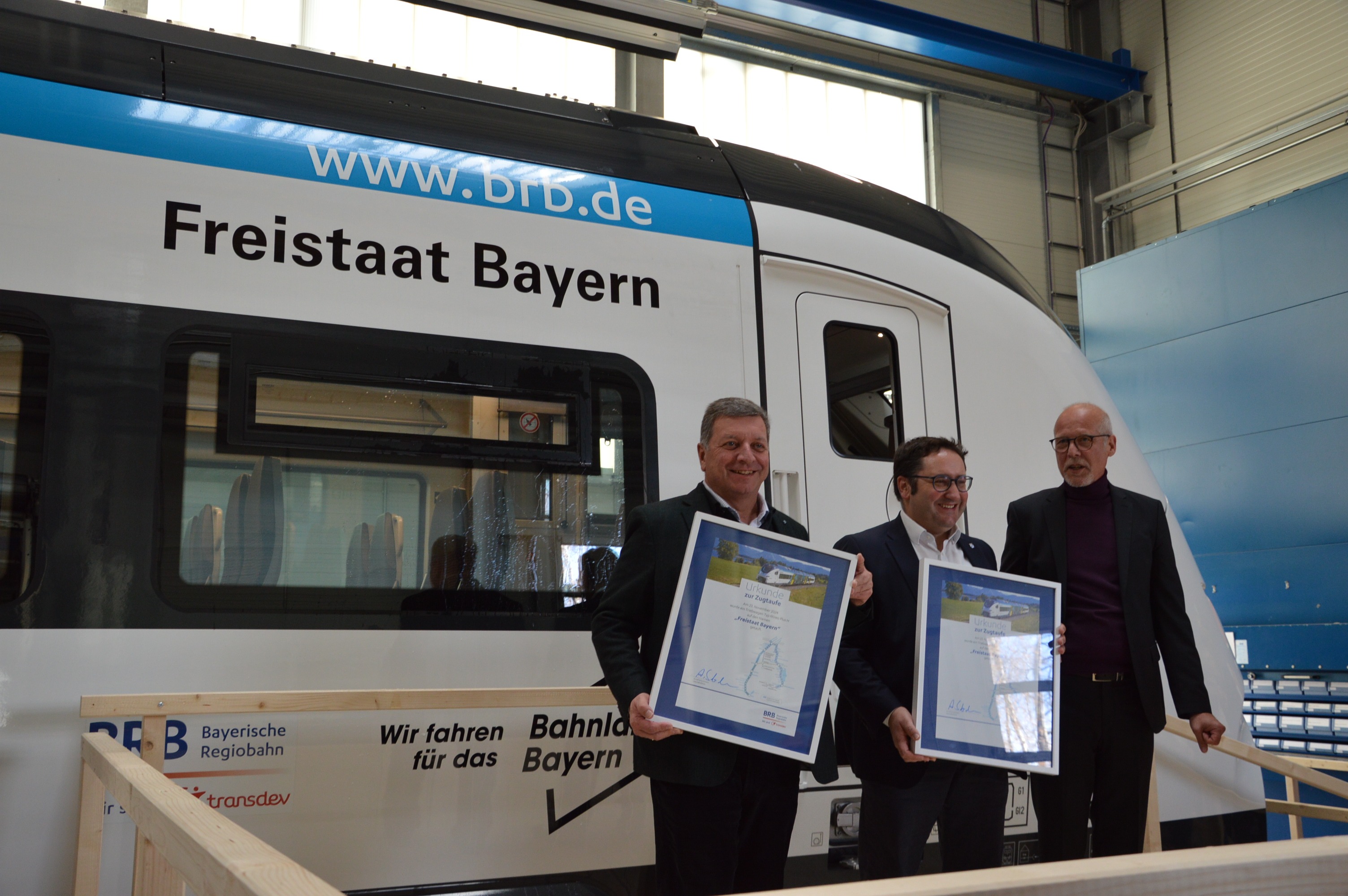 Als Erinnerung gab es für die beiden Taufpaten, Verkehrsminister Christian Bernreiter und Wirtschaftsstaatssekretär Tobias Gotthardt, eine Urkunde, überreicht durch BRB-Geschäftsführer Arnulf Schuchmann (von links). © BRB