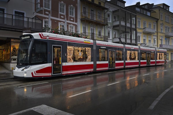 Erstmals schmückt eine festliche Weihnachtsbeleuchtung einen Tramlink der Traunseetram. Damit wird die vorweihnachtliche Stimmung in der Stadt unterstrichen, als auch ein weiteres Zeichen für den besonderen Charakter von Gmunden gesetzt. © Stern & Hafferl-Verkehr