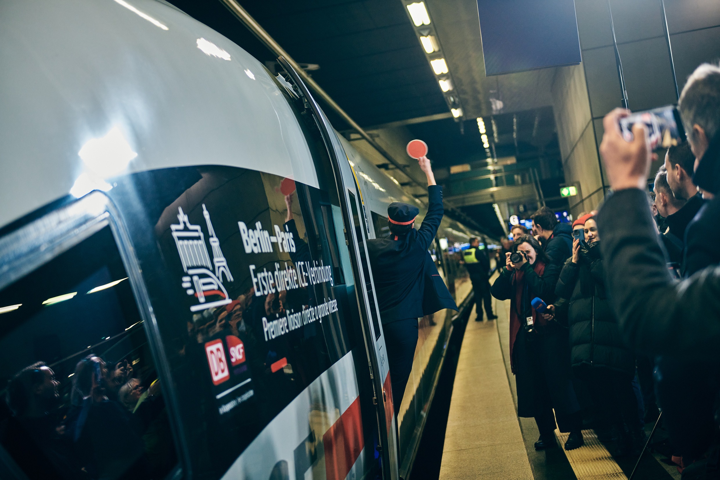 Seit heute sind Berlin und Paris erstmals direkt mit dem ICE verbunden. Richard Lutz, Vorstandsvorsitzender der Deutschen Bahn (DB), François Delattre, Botschafter Frankreichs in Deutschland, Bundesverkehrsminister Volker Wissing, Berlins Regierender Bürgersmeister Kai Wegner sowie Jean-Baptiste Guenot, Leiter der Abteilung Europäische Märkte & Internationale Entwicklung SNCF Voyageurs, schicken den ersten ICE in Berlin Hauptbahnhof feierlich auf die Reise in die französische Hauptstadt. Die Fahrtzeit von Stadtzentrum zu Stadtzentrum dauert rund acht Stunden. Die von DB und SNCF Voyageurs in Kooperation betriebenen Züge fahren über Frankfurt Süd, Karlsruhe und Straßburg. Damit gibt es auch zum ersten Mal eine Direktverbindung am Tag zwischen Berlin und der elsässischen Metropole, dem Hauptsitz des Europäischen Parlaments.
