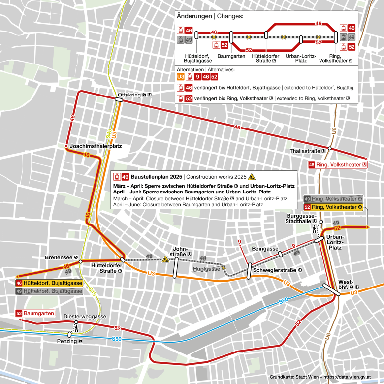 Während der Bauarbeiten kann die Linie 49 nicht fahren, aber der Großteil der Strecke wird von den Straßenbahnlinien 46 und 52 übernommen, die zu diesem Zweck verlängert werden. Zusammen mit alternativen Verkehrsangeboten bleibt der 14. Bezirk damit auch während der Bauarbeiten gut ans Öffi-Netz angebunden.