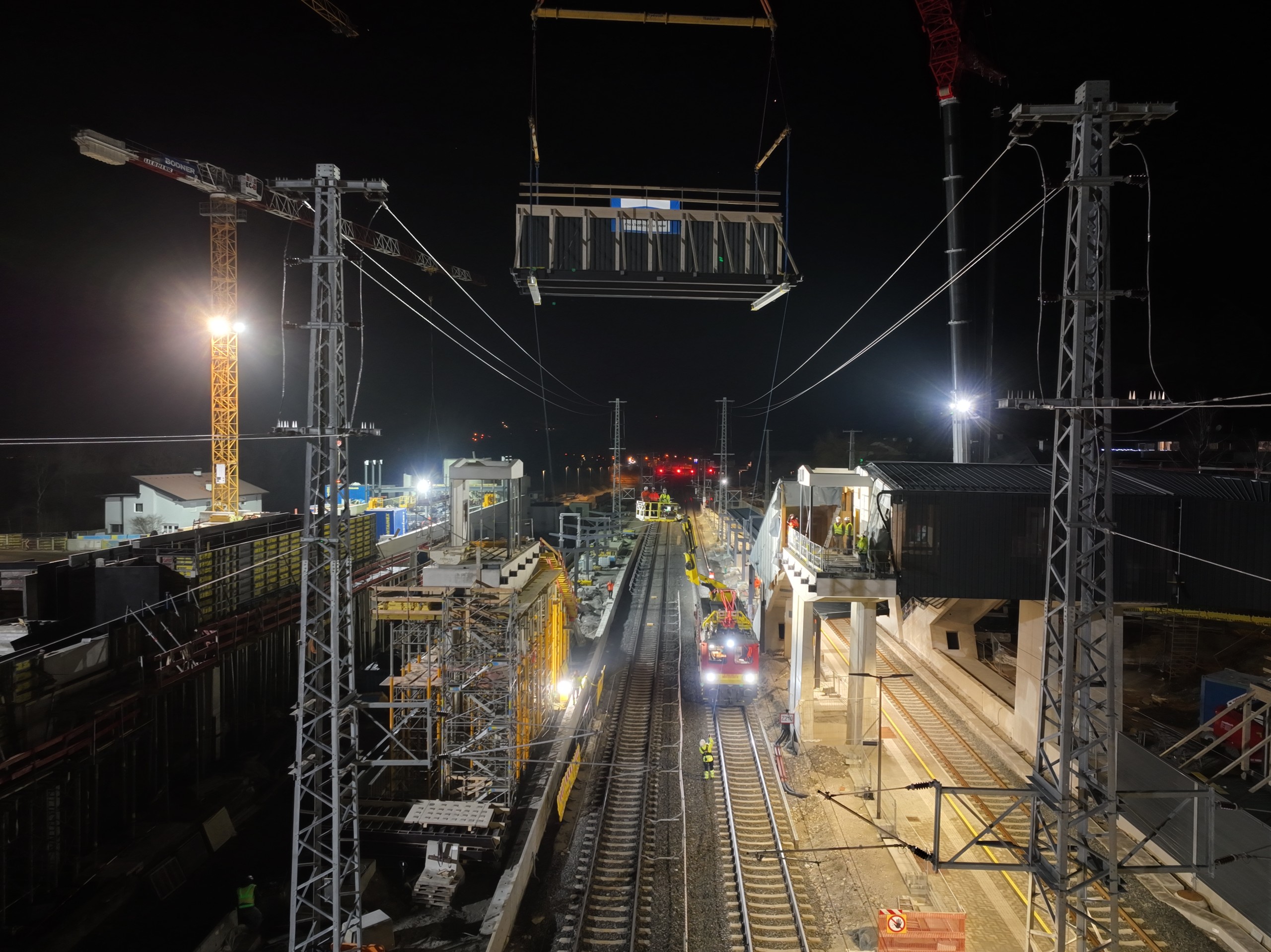 Kürzlich haben die Bautrupps einen besonders herausfordernden Arbeitsschritt erfolgreich gemeistert. In zwei Nachtschichten wurde jeweils ein 13 Meter langer Abschnitt für den neuen Fuß- und Radsteg eingehoben. Damit die Arbeiten über den Bahngleisen sicher und rasch vonstattengehen, musste bedingt durch den Aufstellort und die dynamische Belastung ein 450-Tonnen-Kran anrücken. Der hatte dann allerdings mit den „nur“ 15 Tonnen schweren Fertigteilen leichtes Spiel. Aus Sicherheitsgründen waren die Streckengleise während der Kranarbeiten für den gesamten Zugverkehr gesperrt. Zimmerer und Montagespezialisten haben die Fertigteile seit Anfang Dezember vor Ort gefertigt.