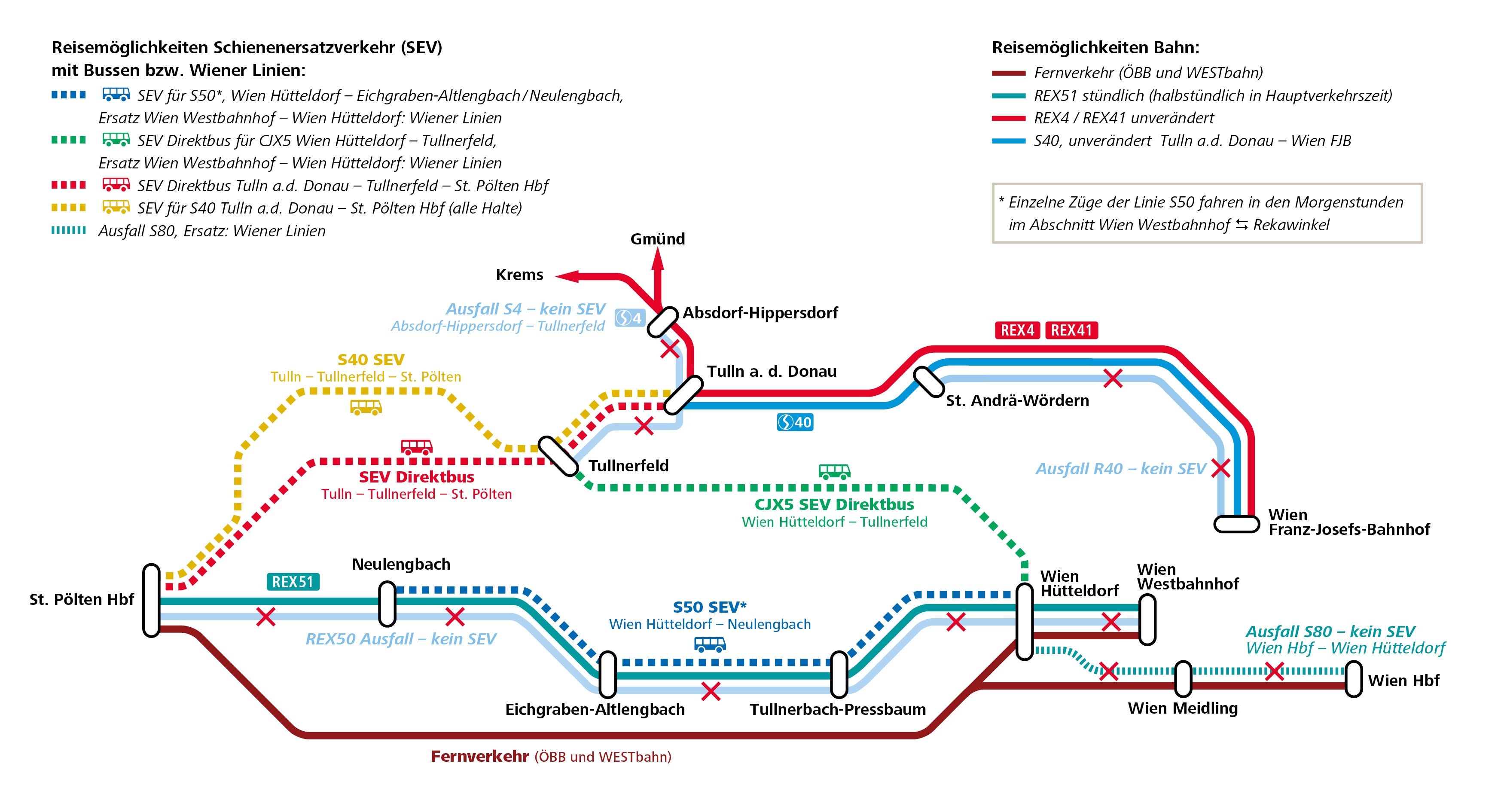 Blaue Linie: Schienenersatzverkehr mit Bussen zwischen Wien Hütteldorf und Eichgraben-Altlengbach/Neulengbach. Speziell für Schüler:innen fahren einzelne Züge der Linie S50 in den Morgenstunden zwischen Wien Westbahnhof – Rekawinkel in beide Richtungen. Aufgrund der Umleitung von Zügen über die alte Weststrecke sind keine zusätzlichen Züge im Nahverkehr möglich.