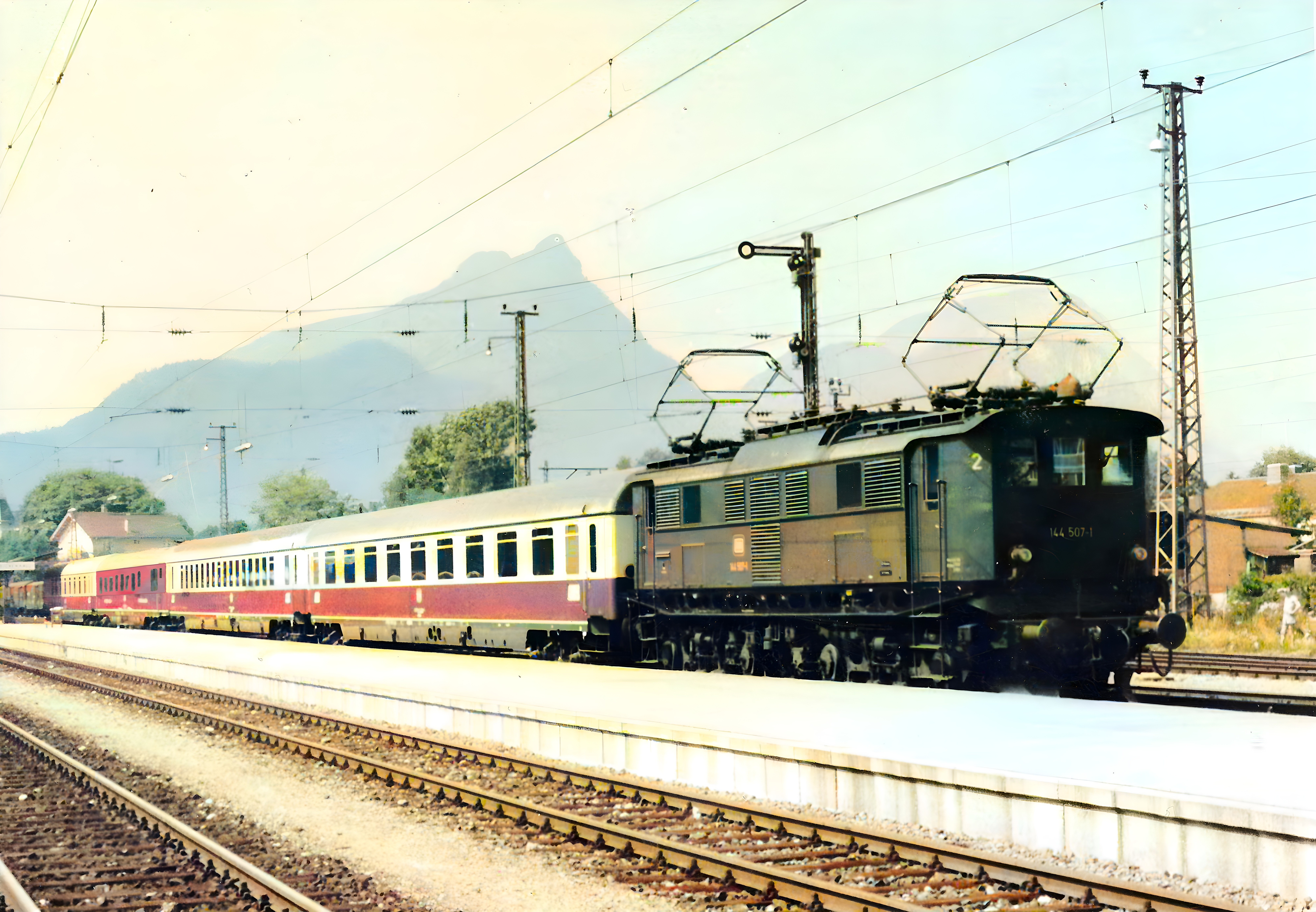 Reminiszenz – vor 50 Jahren der IC „Königssee“ (noch ausschließlich 1. Wagenklasse) mit 144 507 in Bad Reichenhall Hbf; Juni 1974. Nachbearbeitet durch in-motion.me
