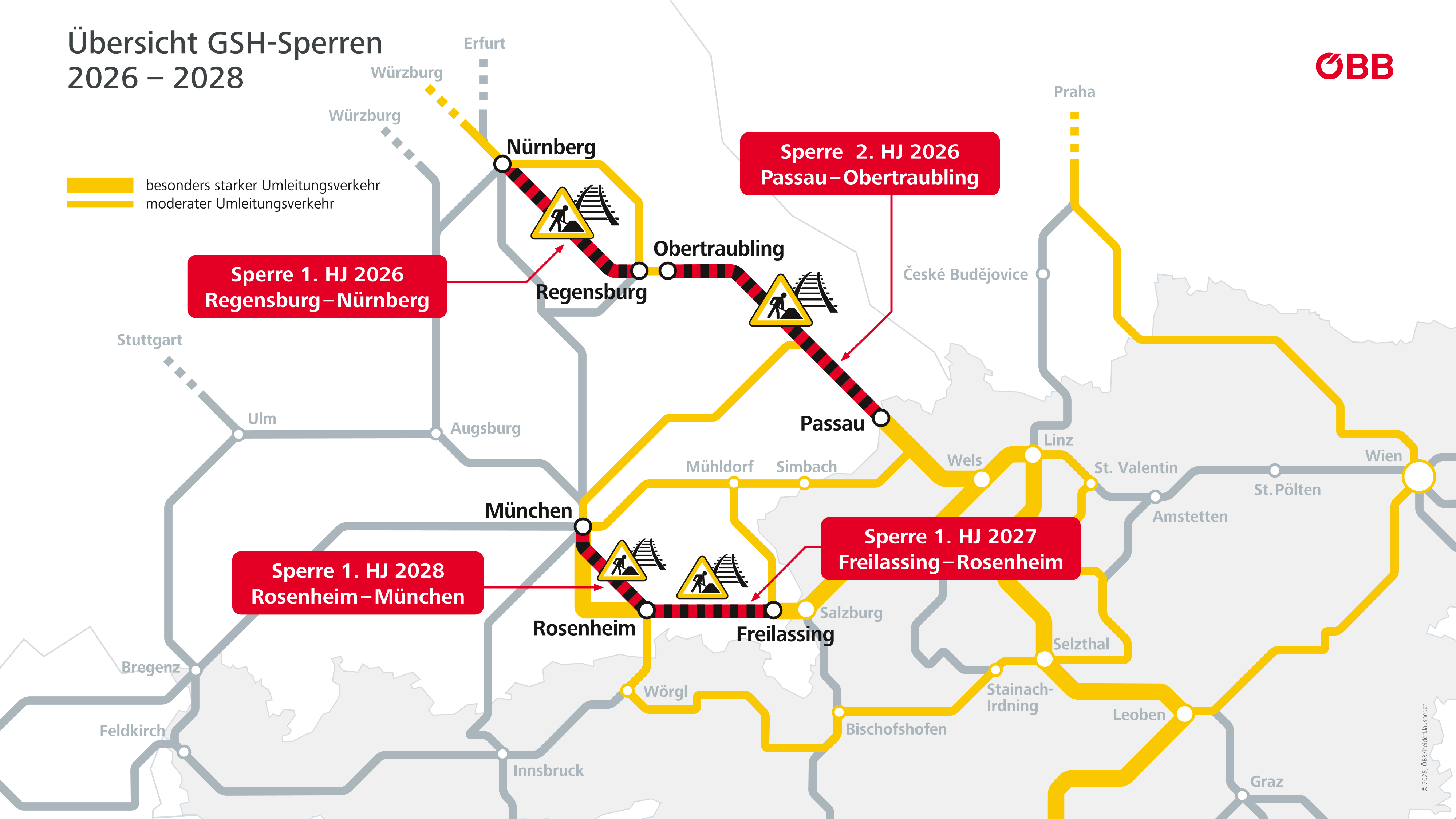 Als wichtiger Knotenpunkt im nationalen und internationalen Bahnverkehr spürt Salzburg die Auswirkungen der teilweise überalterten Bahninfrastruktur im Süden von Deutschland besonders stark. Einschränkungen auf den Bahnstrecken im Nachbarland sorgen immer wieder für Verspätungen und kurzfristige Umleitungen. Insbesondere die zahlreichen kurzfristigen Störungen am Deutschen Eck haben starke negative Auswirkungen auf die Qualität im österreichischen Fernverkehr. Die großen Korridorsanierungen 2026 und 2027 werden sicherstellen, dass diese Probleme künftig der Vergangenheit angehören und auch in Deutschland eine moderne und leistungsfähige Infrastruktur für den Bahnverkehr zur Verfügung steht – mit langfristigem Nutzen für Salzburg.