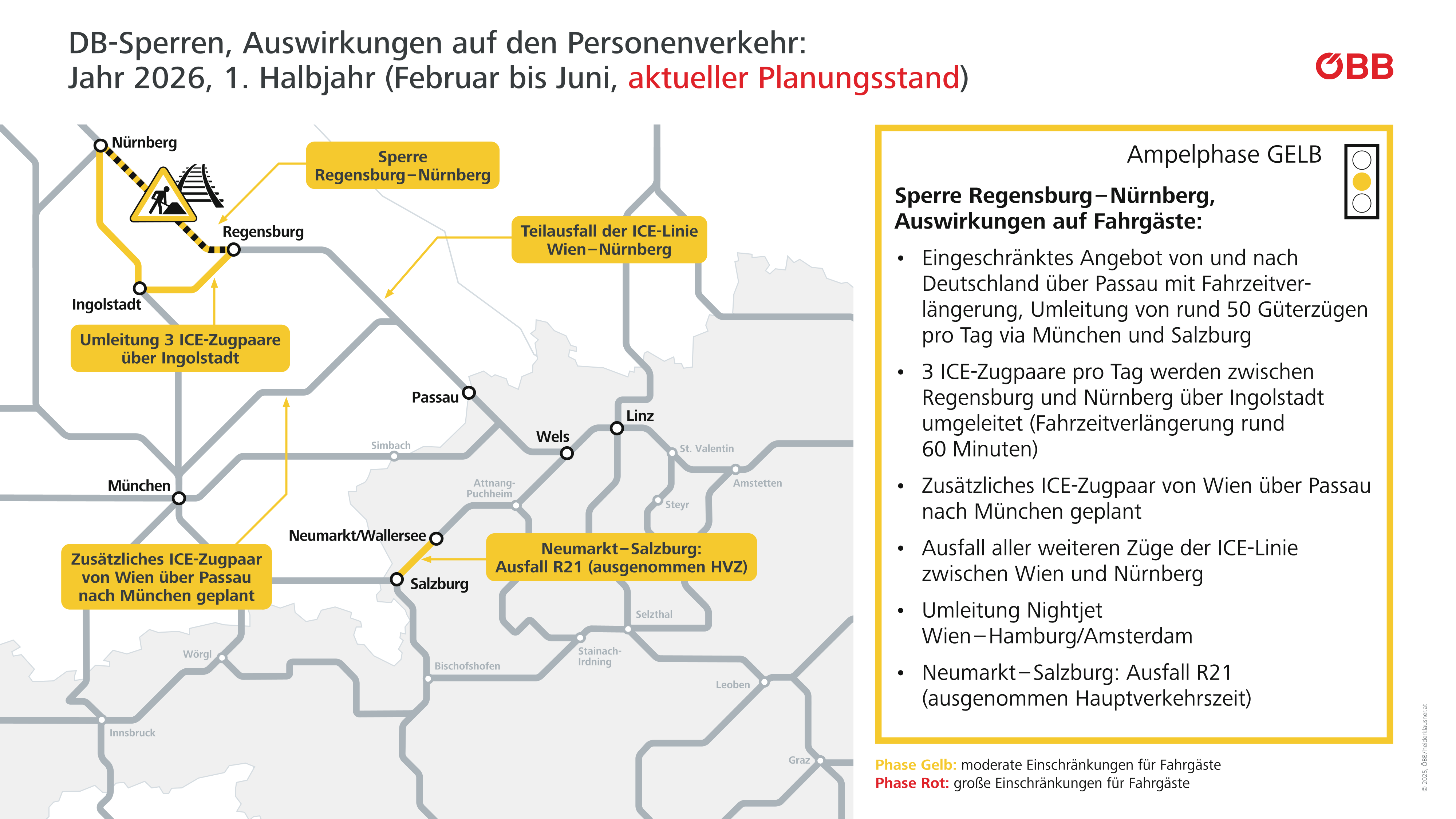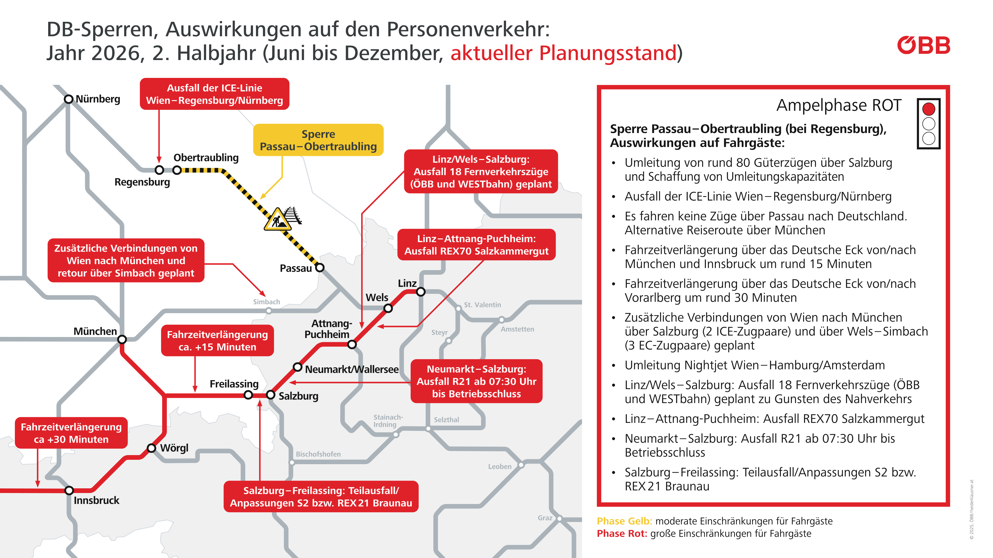 Mit dem Auftakt der Streckensanierungen und der dafür notwendigen Streckensperren in Bayern beginnt im kommenden Jahr eine Phase mit Auswirkungen auf Salzburg. Das Land Salzburg, die Industriepartner und die ÖBB arbeiten eng zusammen, um diese Auswirkungen so gering wie möglich zu halten. Gemeinsames Ziel ist es, die Mobilität für Pendler:innen, Reisende und die Wirtschaft in Salzburg bestmöglich aufrecht zu erhalten. Das Angebot im Bundesland Salzburg bleibt während der Einschränkungen weiterhin hoch und dicht, sowohl im Nahverkehr als auch im Fernverkehr.