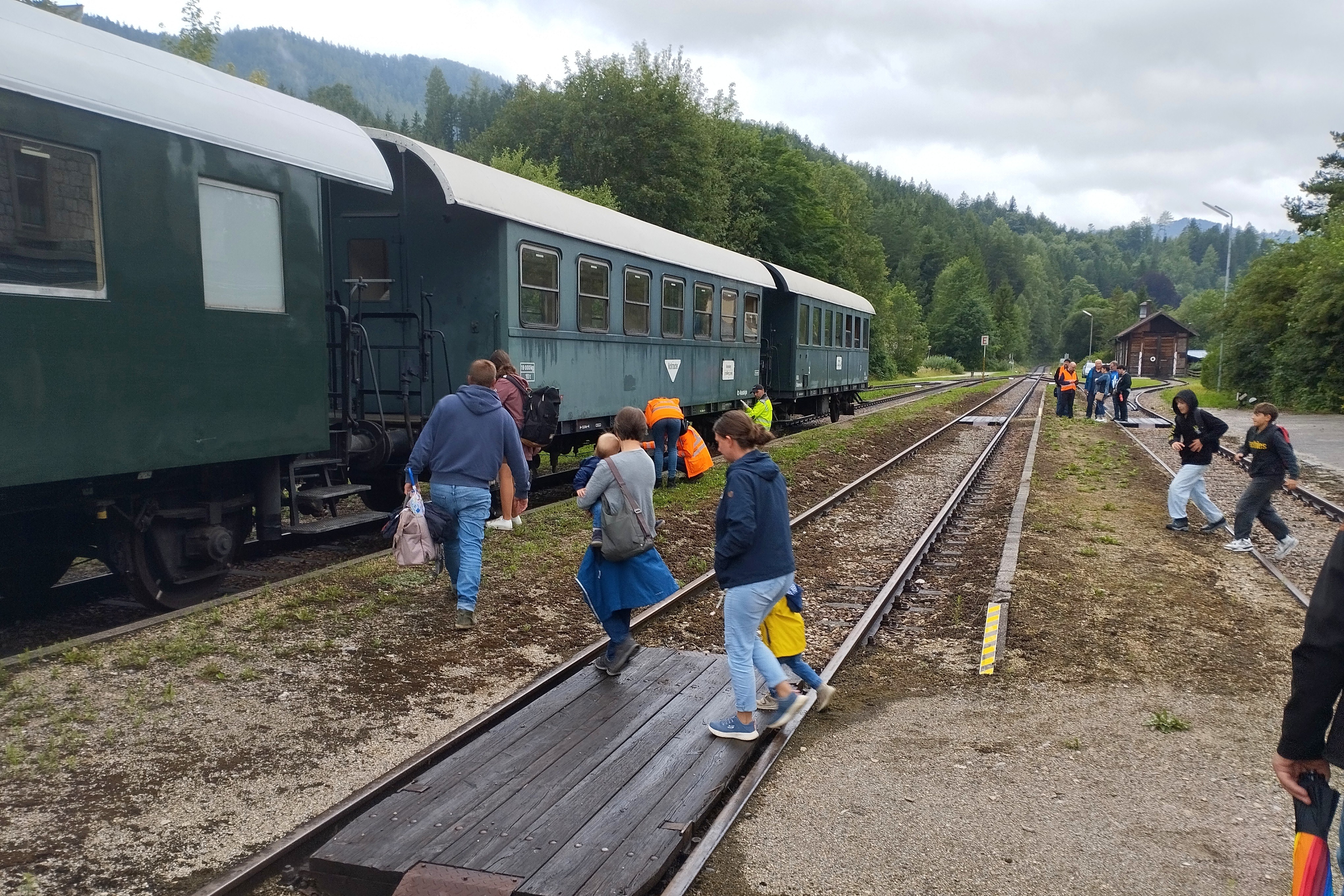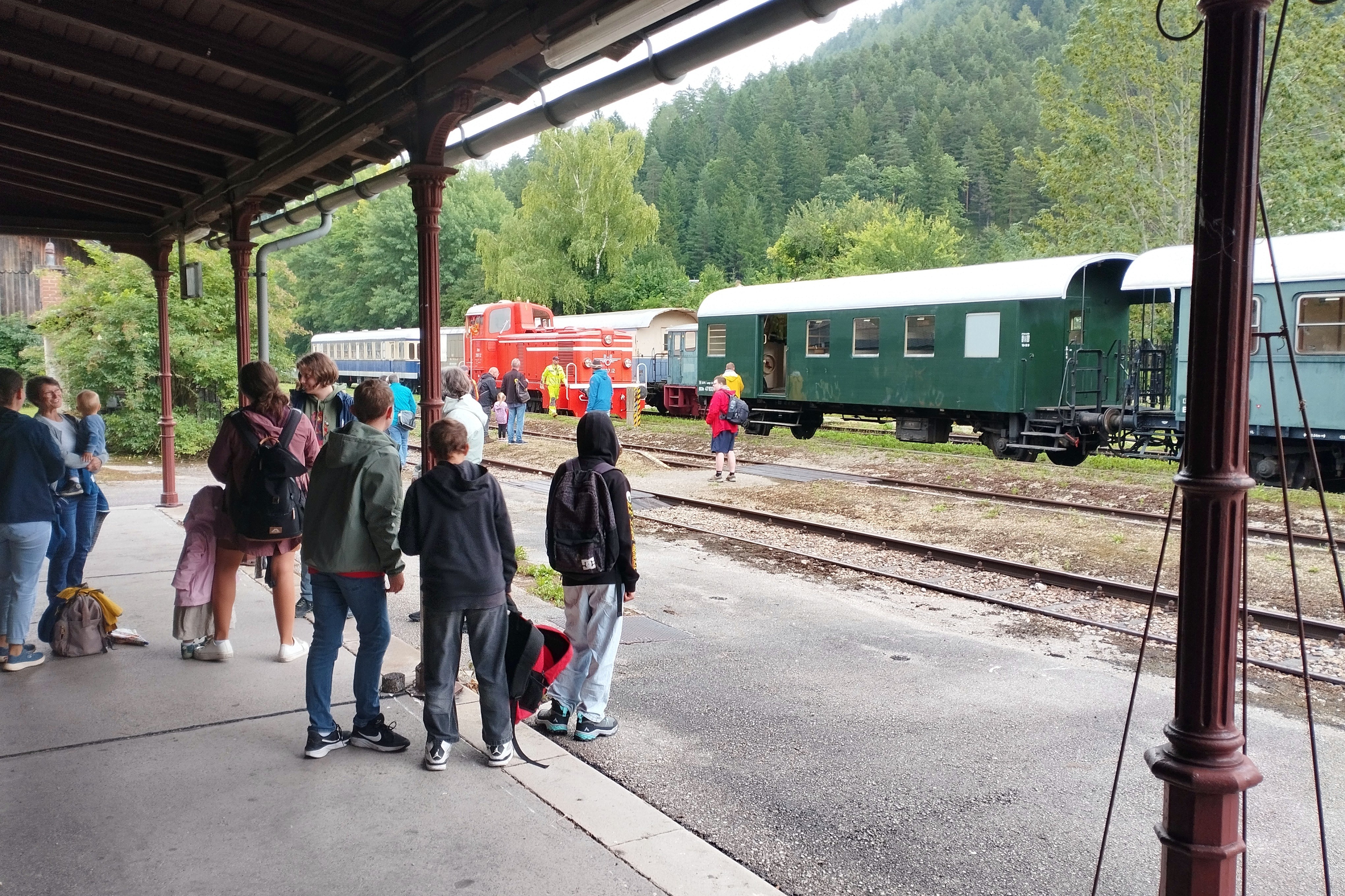 Ungewohnte Menschenmassen im Bahnhof St. Aegyd am Neuwalde nach der Ankunft des ÖCD-Zuges aus Hohenberg.