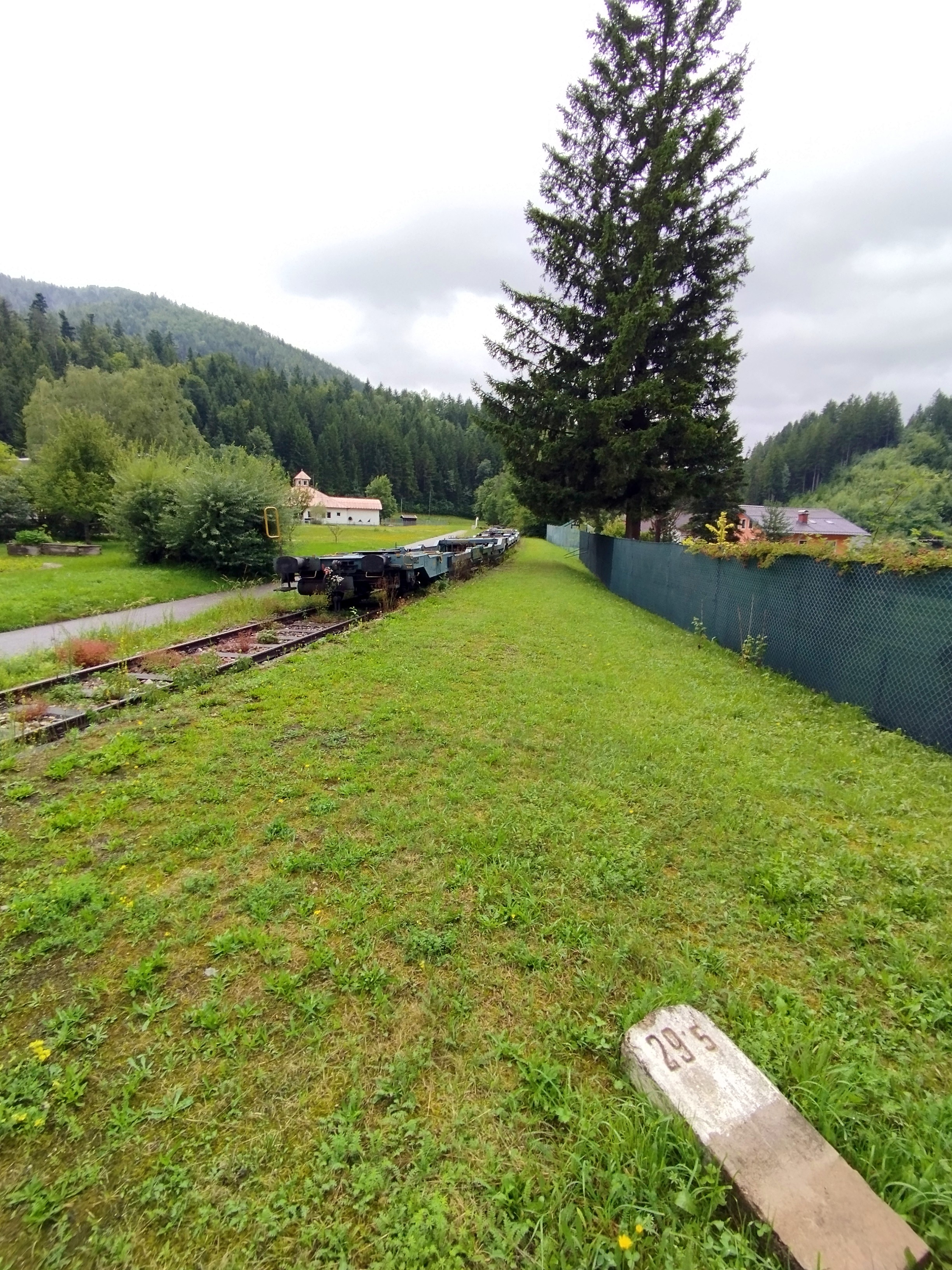 Haltestelle Markt St. Aegyd am Neuwalde, das derzeitige Streckenende. Am 27.7.2025 mit abgestellten Güterwagen. Fortsetzung im Hintergrund leider nur mehr als Radweg bis zum ehemaligen Endbahnhof Kernhof. Personenzüge bis zu dieser Haltestelle wieder am So, 17.8.2025, direkt zum St. Aegyder Bauernmarkt.