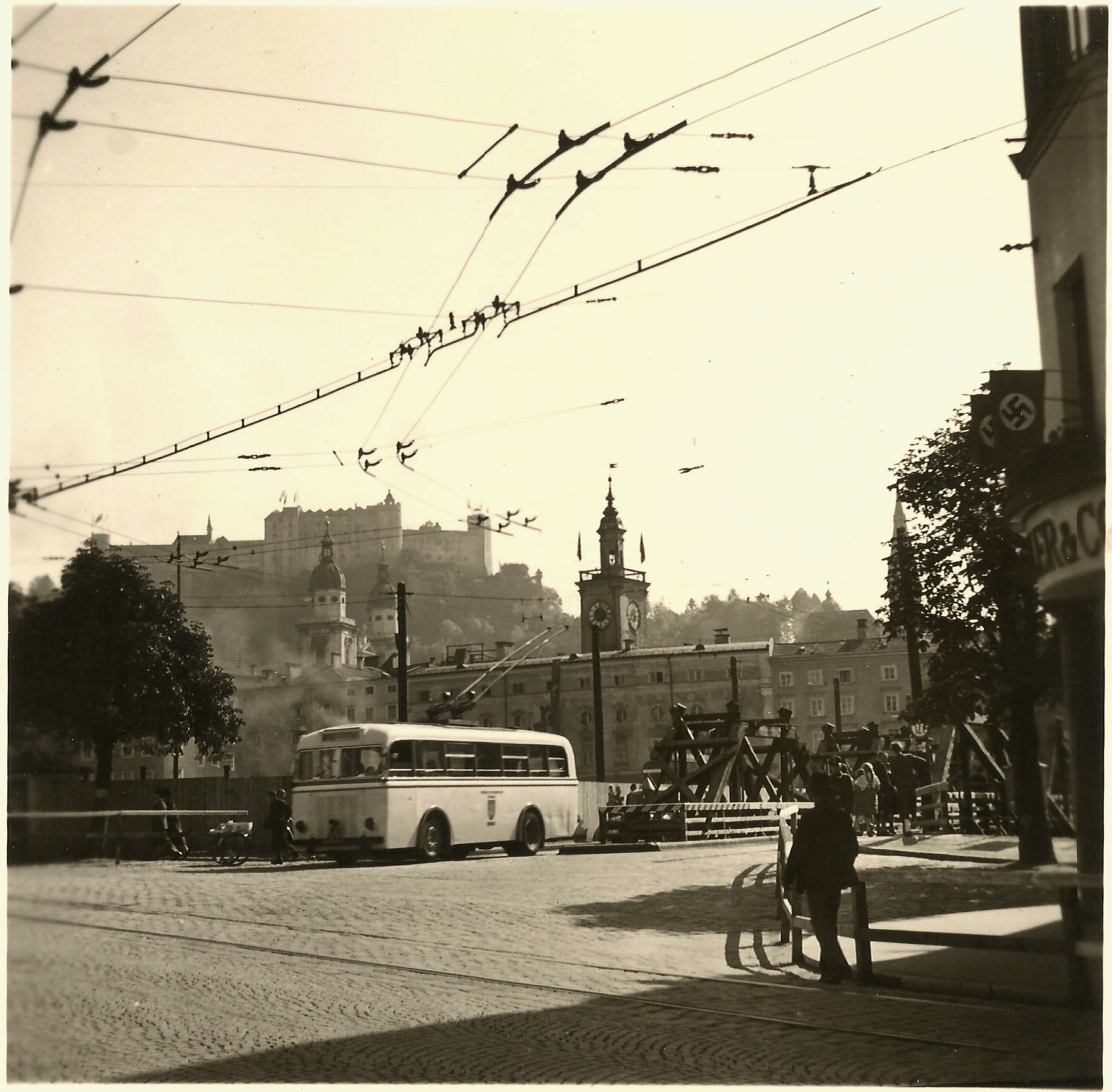 A new trolleybus crosses river Salzach in late October 1940 – the track in the foreground was not the tram but the Salzburger Lokalbahn. Sammlung R.Lutz
