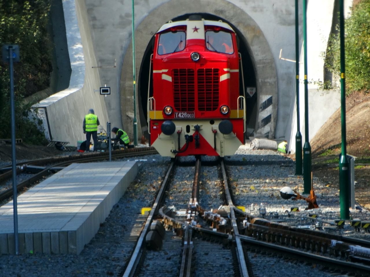 „Am 2. Oktober fand auf der Strecke Tanvald–Kořenov eine weitere Probefahrt mit der Lokomotive der Reihe 715 (in den 1960er-Jahren von SGP in Österreich hergestellt und auf der Erzbergbahn getestet) statt. Ziel war die Überprüfung der Funktionalität von drei speziellen Zahnstangenweichen mit einem Abt-Zahnstangensystem, die wir entworfen, gefertigt und geliefert haben.