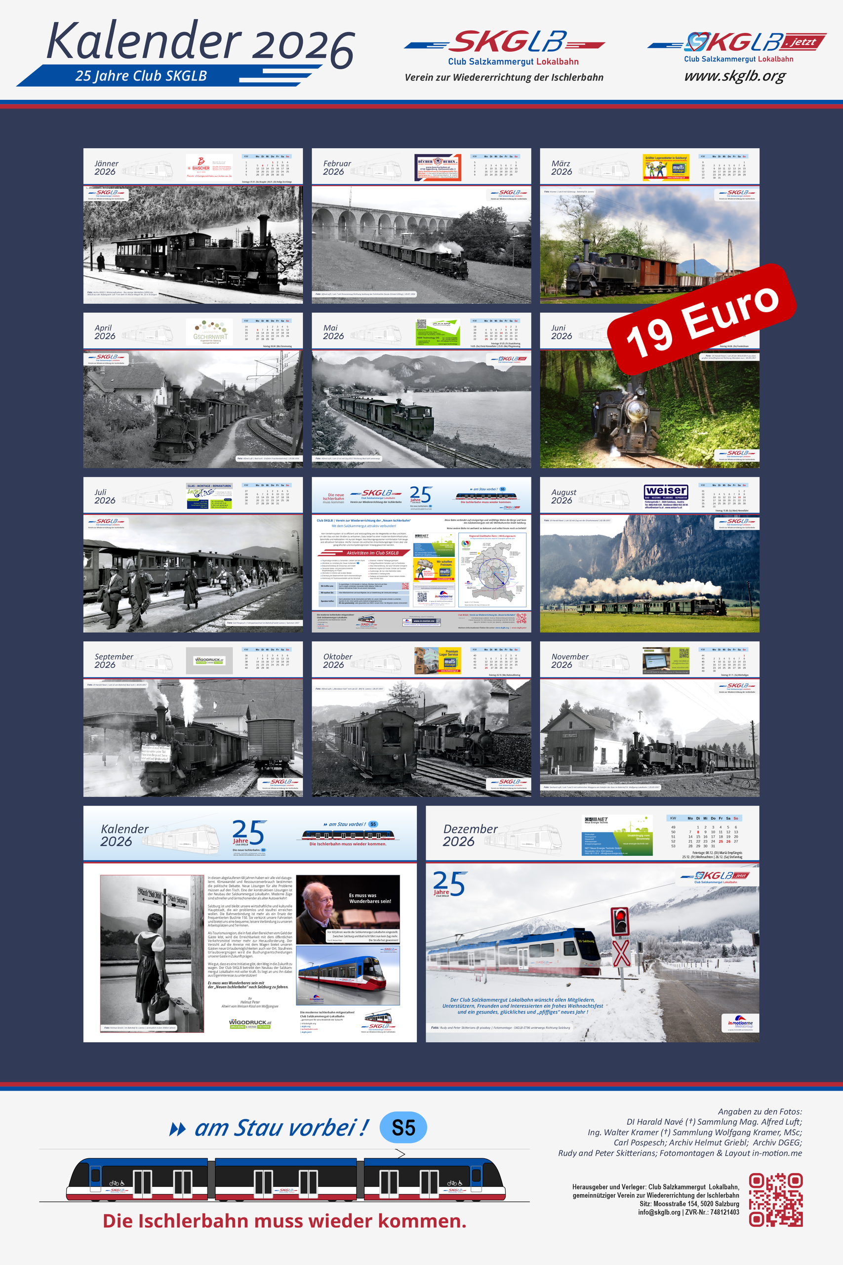 Für das Jahr 2026 wurde wieder ein exklusiver Kalender zum Thema "Salzkammergut Lokalbahn" (SKGLB) erstellt. Historische Bilder wurden mit hohem Aufwand durch die in-motion.me | Media Group restauriert und digital wiederaufbereitet - und in einem Kalender im Format A3quer zusammengefasst.
